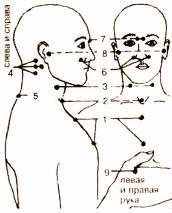 На схеме вы видите предложенную ею систему активных точек, массаж которых позволяет предупреждать простудные заболевания. Массировать их нужно кончиком пальца вращательными движениями сначала по, затем против часовой стрелки 3-4 секунды в каждую сторону. Лучше начинать с легкого нажима, постепенно повышая интенсивность воздействия. Массировать зоны 2, 3 и 4 нужно с особой осторожностью легкими движениями пальцев сверху вниз.