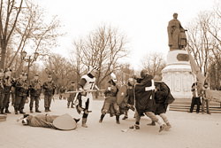 Затем «наши» гнули и ломили рыцарей, но те упорно не хотели падать на холодноватую брусчатку: «Да падай ты уже», - сердились замерзшие зрители. Наконец, рыцарь упал и хорошо упал: руки раскинул, шлем покатился по скверику. Все, включая милиционеров, вздохнули с облегчением. «Все, что мы хотели сказать – мы сказали. Нас еще раз просили напомнить, что проводимая акция не согласована!» - весело закончил ответственный за всё это великолепие.