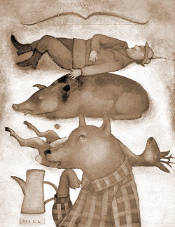 Художнику в полной мере свойственны сказочные (ещё античные) метаморфозы. Повсеместно мы находим в творчестве Ю. Милдеберга одухотворение, полное очеловечение животных – причём понимаемое как процесс, развивающийся «в присутствии» зрителя. Но равным образом процесс этот может быть прочитан и как некоторая «анимализация» человеческих существ. Замечательна маленькая работа, на которой пьяный (или мёртвый) лучник-охотник растянулся на земле наряду с убитыми оленем и кабаном.